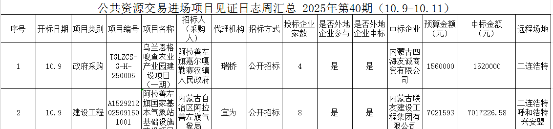 公共资源交易进场项目见证日志周汇总 2025年第40期(10.9-10.11)