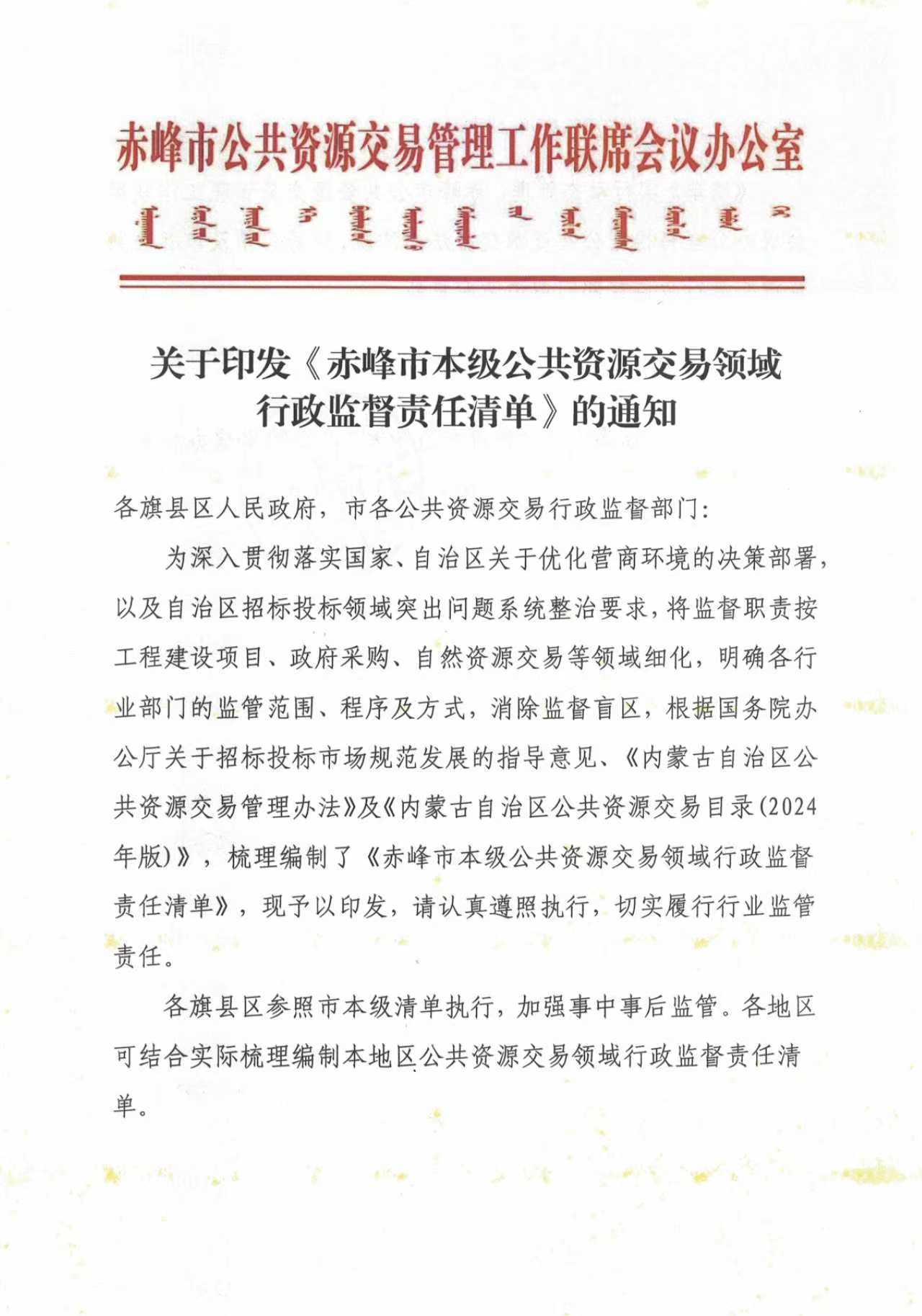 关于印发《赤峰市本级公共资源交易领域行政监督责任清单》的通知