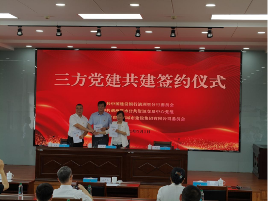 为深入贯彻新时代党的建设总要求,以高质量党建引领高质量发展,7月1日,满洲里市公共资源交易中心、中国建设银行满洲里分行、满洲里市口岸城市建设集团有限公司联合举办党建共建签约仪式,同步开展庆祝建党104周年主题党日活动,开启政企银三方协同发展新篇章。