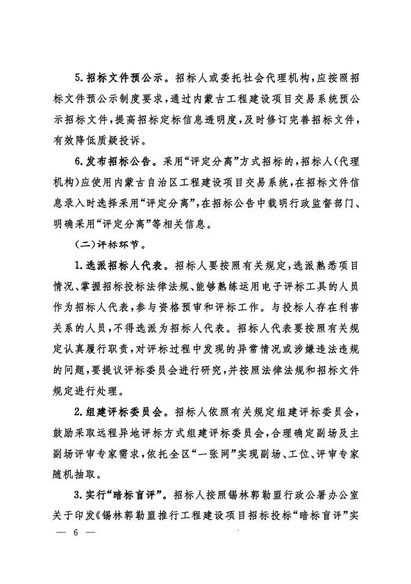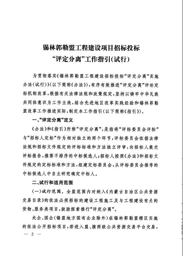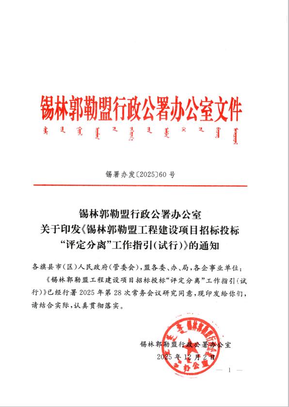 锡林郭勒盟行政公署办公室关于印发《锡林郭勒盟工程建设项目招标投标“评定分离”工作指引(试行)》的通知