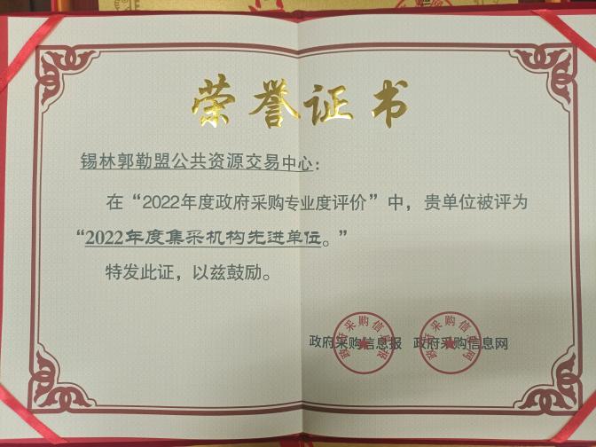 2月16日,由财政部指定政府采购宣传媒体《政府采购信息报》,联合政府采购信息网举办的“政府采购20周年双庆典暨18届全国政府采购集采年会”在北京召开。会上,对各政府采购先进单位进行了表彰。通过政府采购代理项目数量及质量、学习型政府采购专业队伍建设,采购文件编制、内控建设与全流程管理等六个维度的评价,锡林郭勒盟公共资源交易中心被评为全国“2022年度集采机构先进单位”。